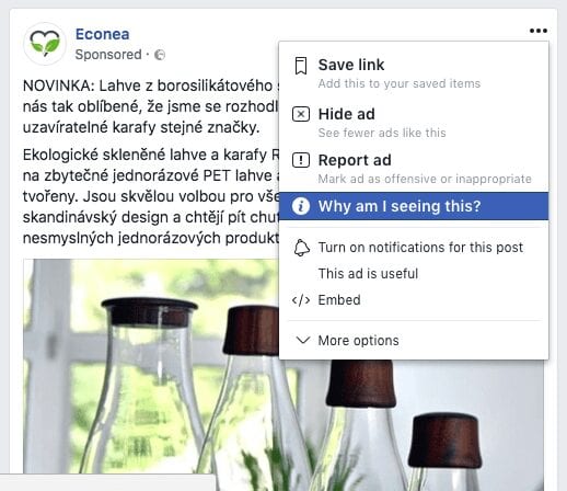 Zobrazuje se vám jako uživateli ve feedu nějaká reklama a vás by docela zajímalo proč? U každé reklamy si můžete pomocí kliknutí na ikonku tří teček v pravém horním rohu příspěvku rozkliknout „Proč se mi tohle zobrazuje“, kde se dozvíte něco málo o tom, jak je reklama zacílena.