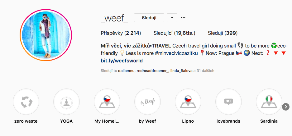 Influenceři většinou pro Stories používají sladěné náhledové obrázky, které na profilu vypadají pěkně. Příkladem může být třeba účet YouTuberky a bloggerky @_weef_: