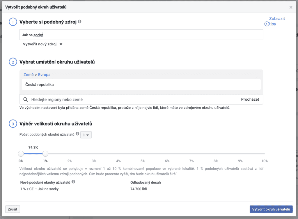 Při tvorbě Lookalike Audience si také vybíráte velikost nového publika, které ovlivňuje také přesnost shody původního publika a Lookalikes. Doporučuji používat nejčastěji 1% shodu, která je nejpřesnější, maximálně pak 3% shodu, vyšší už podle mých zkušeností bývají hodně nepřesná a ne tak efektivní.