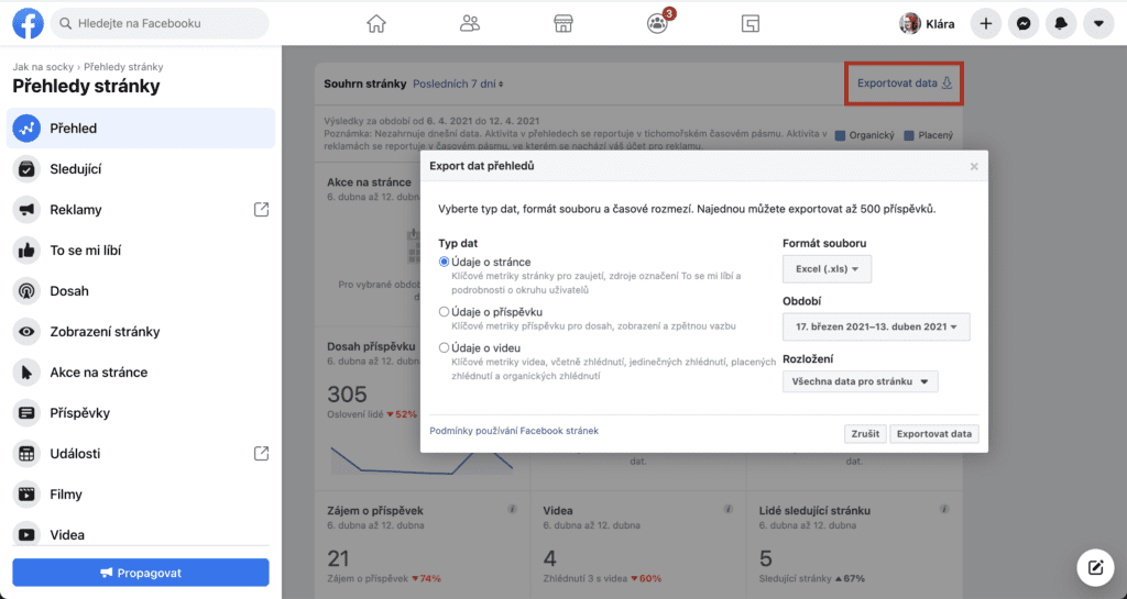Úplná data si můžete z Facebooku stáhnout do .csv nebo .xls.