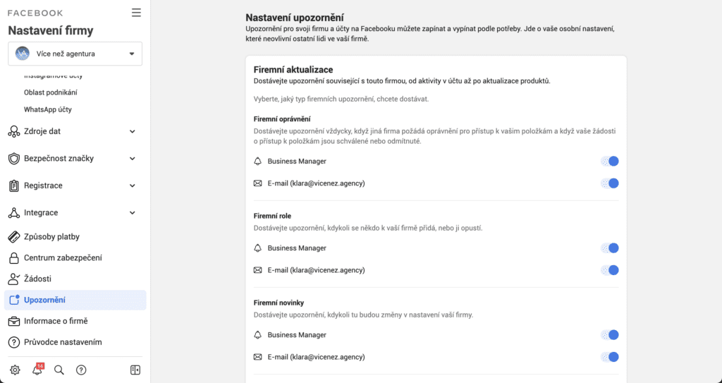 V Business Manageru klikněte na položku Nastavení firmy (a to ať jste jejím správcem nebo ne), a zde téměř na konci nabídek v levém sloupci najdete možnost Upozornění. Zde si můžete vybrat, které notifikace chcete dostávat e-mailem, které v Business Manageru a které vůbec.