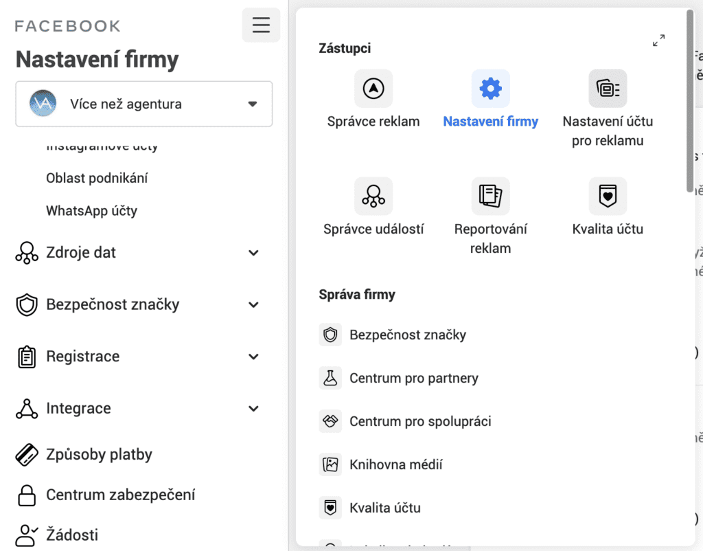 V Business Manageru (nebo Správci reklam, pokud Business Manager nepoužíváte) rozklikněte menu, najdete ho pod symbolem tří čárek v levém horním rohu. Zde pak najděte položku Nastavení účtu pro reklamu.