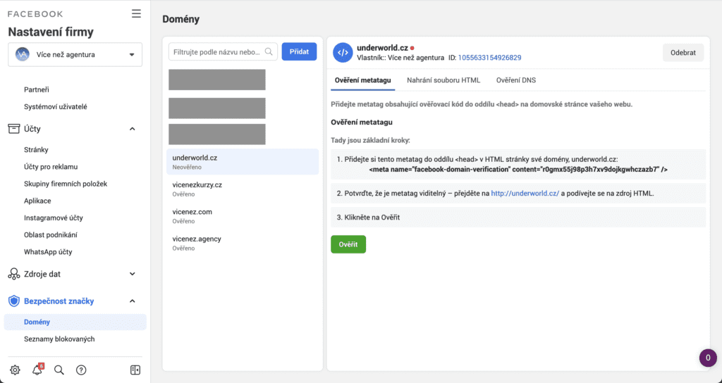 Dalším z důvodů, proč se hodí mít Business Manager, je možnost ověřit si přes něj doménu.