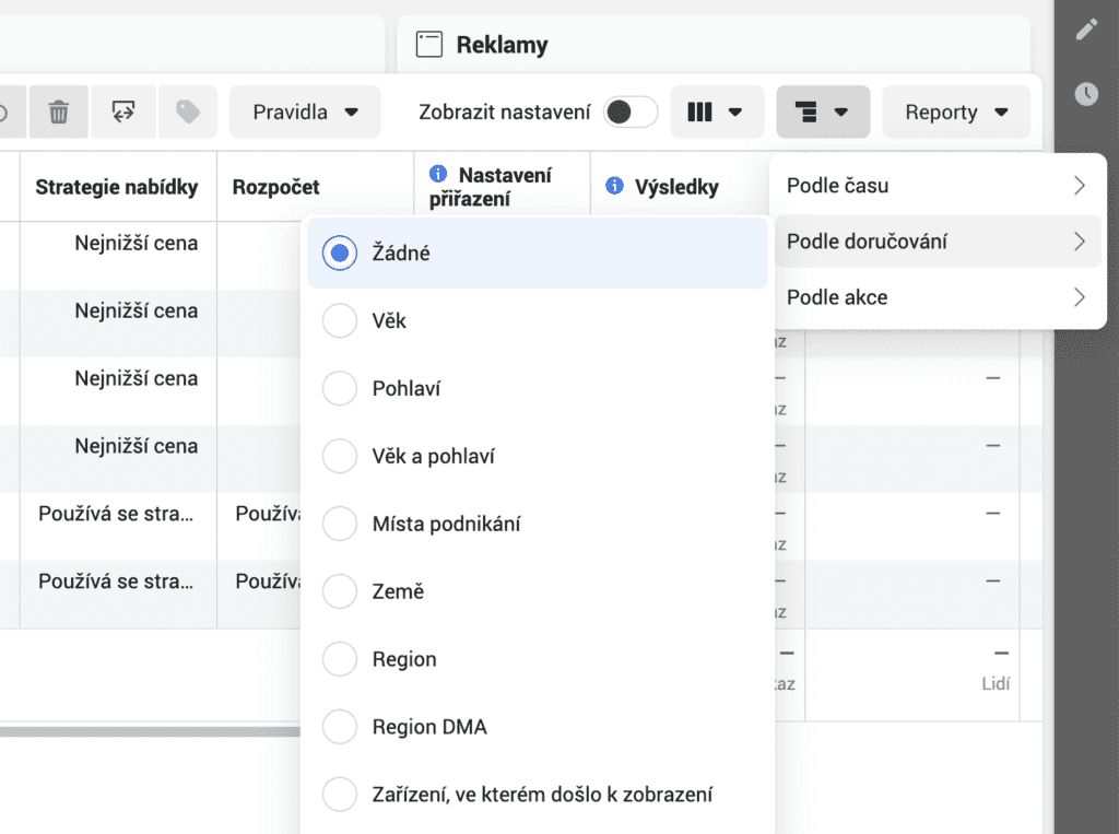 Ve Správci reklam si pomocí tlačítka Rozdělení můžete výsledky reklam rozselektovat podle věku, pohlaví uživatelů, umístění reklamy a podobně. Zjistíte tak, kdo na vaší reklamu reagoval více a kde byly výsledky levnější.
