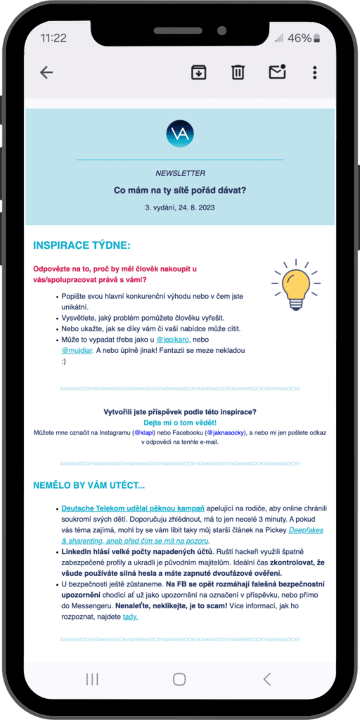Kromě tipu na příspěvek najdete v newsletteru i odkazy na další zajímavé články nebo nejnovější dění na sítích, abyste byli vždy v obraze.