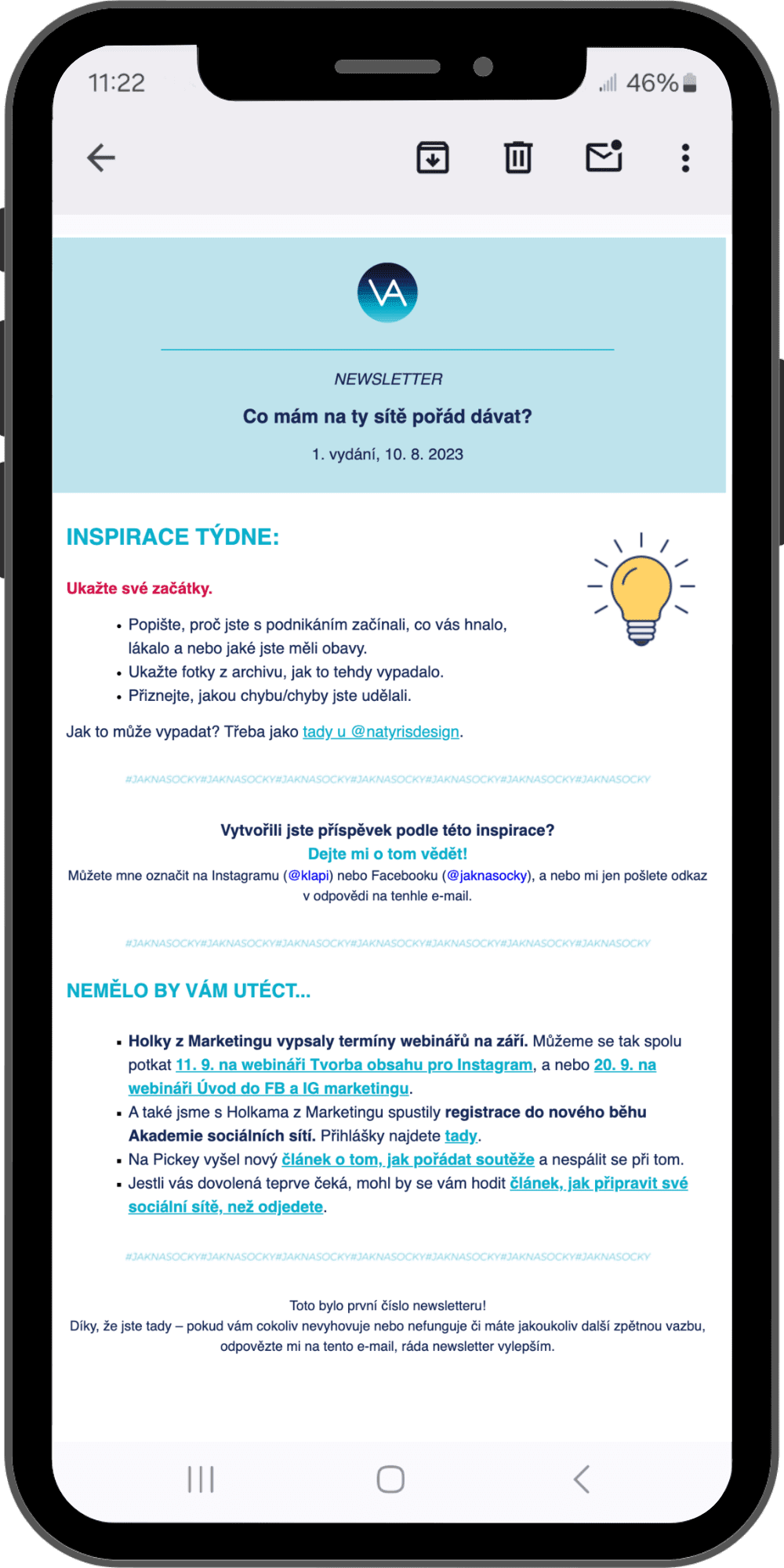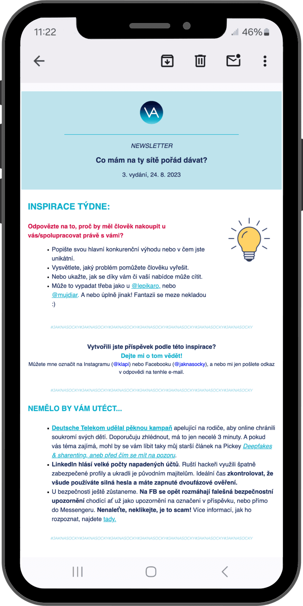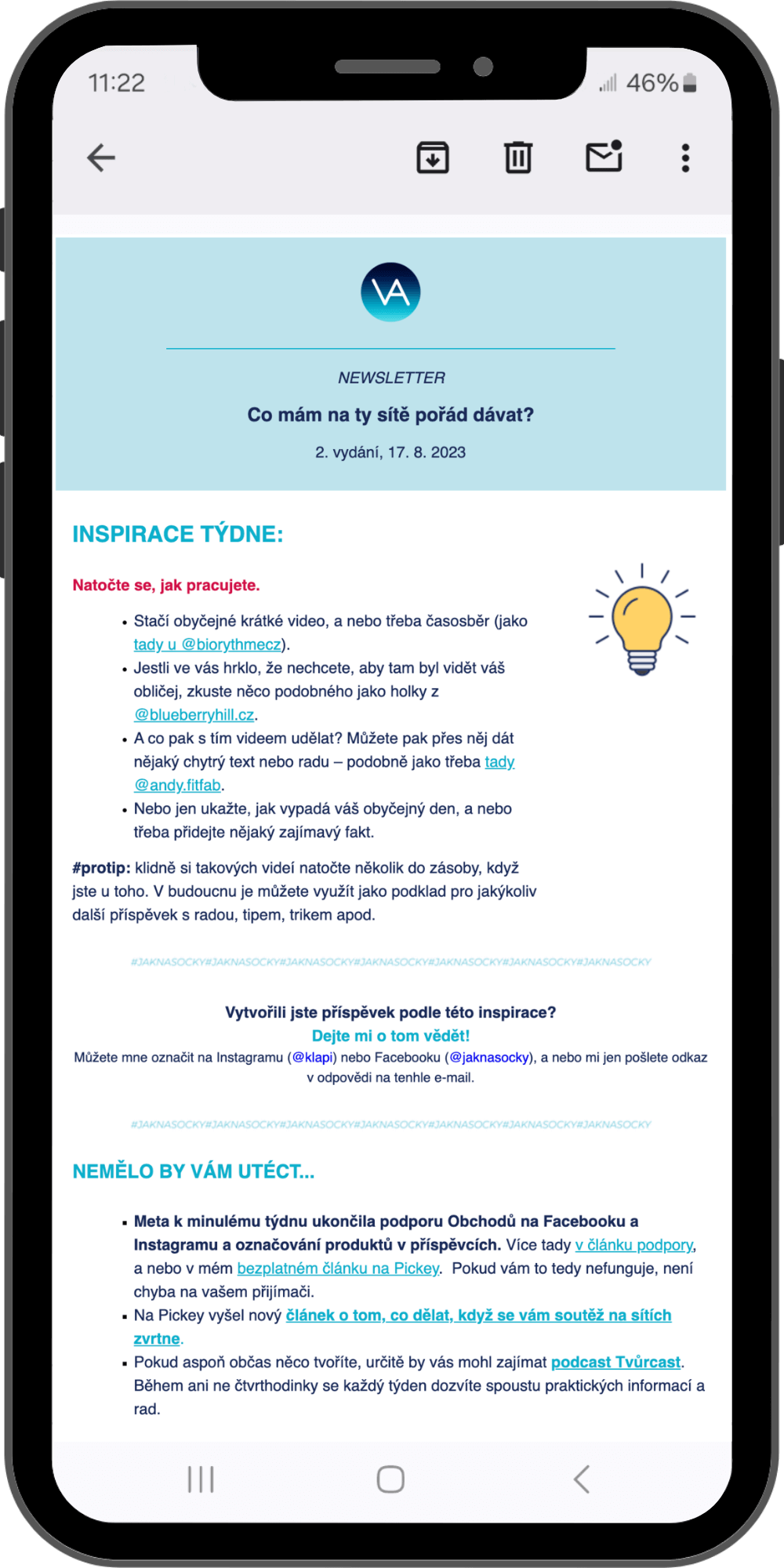 Každý týden dostanete newsletter s 1 tipem na příspěvek. Můžete se inspirovat, můžete ho využít, a nebo si říct, že tohle pro vás není – to už je na vás.